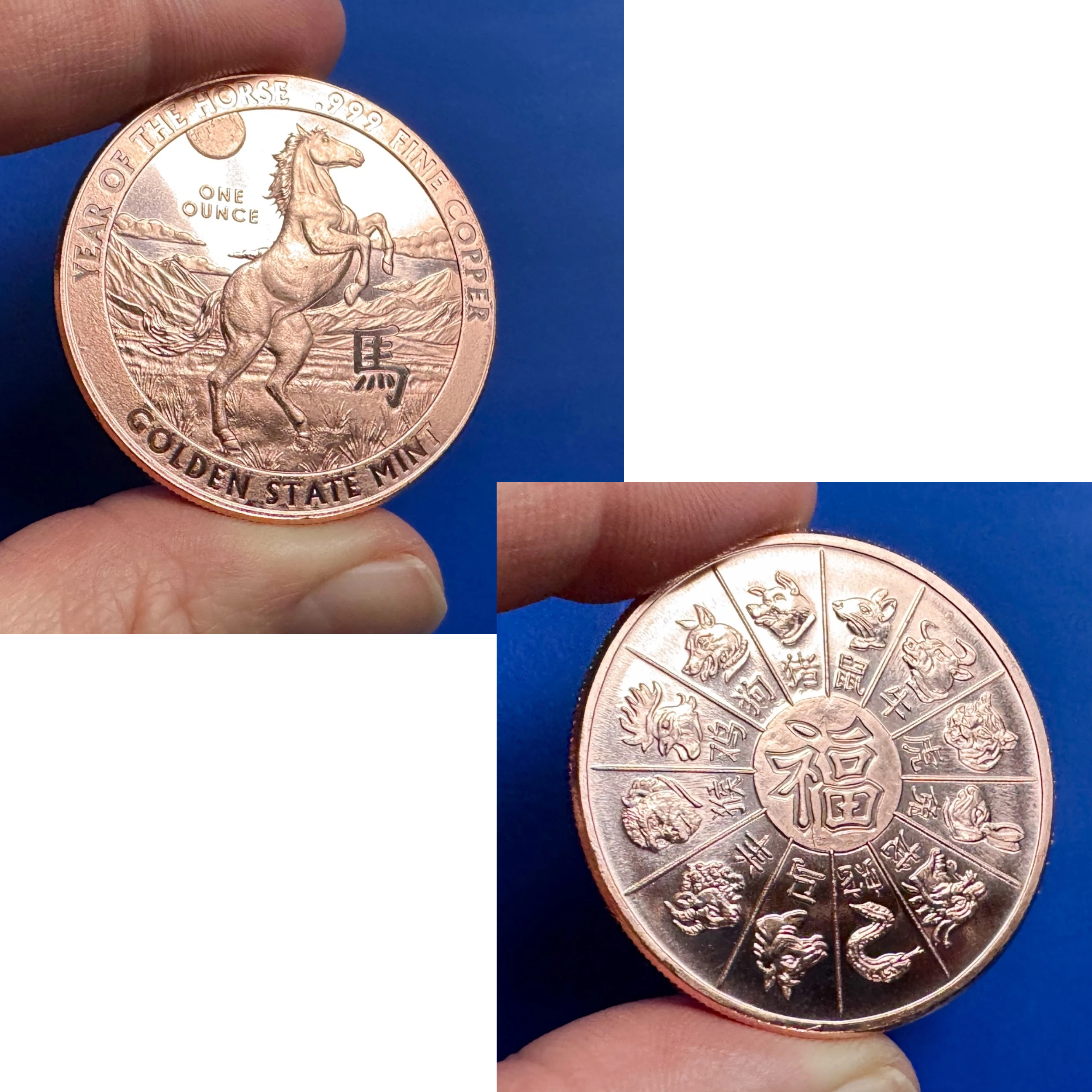 ✔️ DISEÑO★: ANVERSO: muestra al caballo triunfante de pie sobre sus patas traseras entre una cordillera. A la derecha, el carácter chino para «Caballo» está grabado. Sobre el caballo se indica el tamaño «Una Onza». En el borde de la moneda se encuentra el título «Año del Caballo», la pureza «.999 Cobre Fino» y «Golden State Mint» en la parte inferior. ★ REVERSO: los doce animales del zodiaco chino están dispuestos en círculo, cada uno representando un mes del año lunar chino. Este diseño cuidadosamente elaborado abarca la esencia del zodiaco, convirtiendo esta moneda en una valiosa adición a cualquier colección.