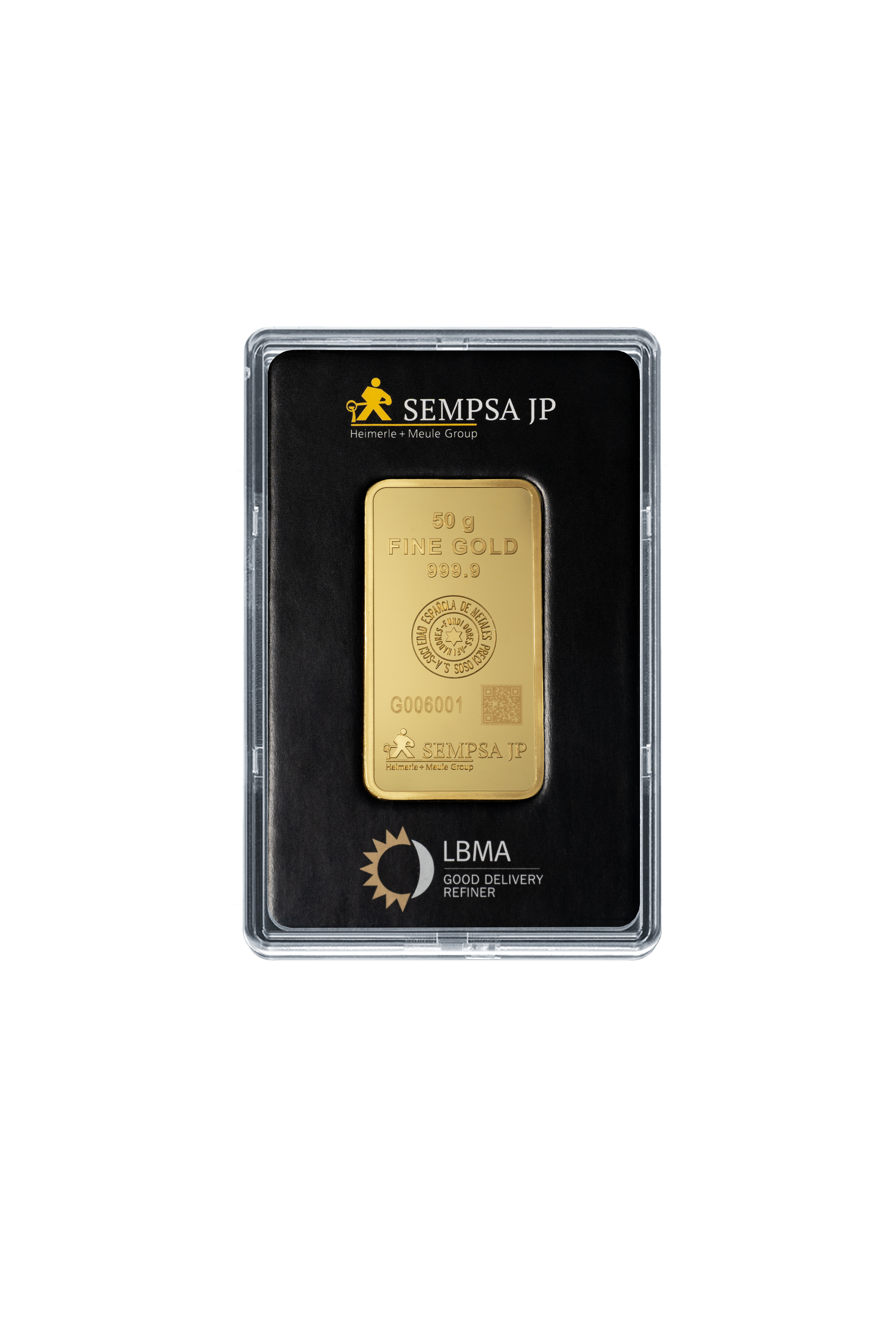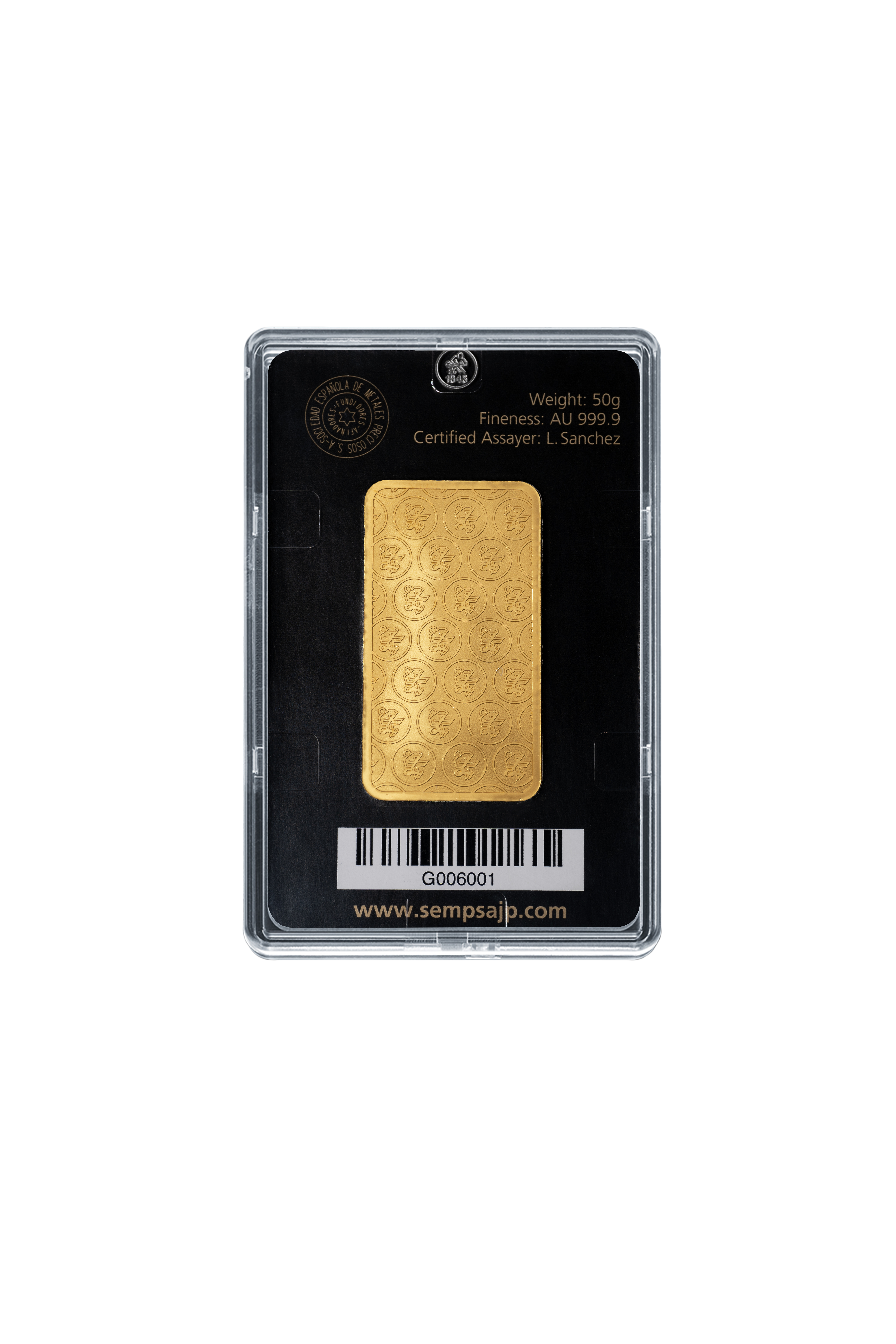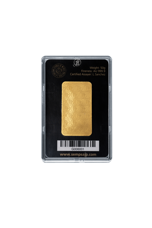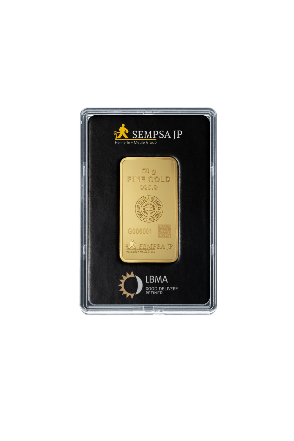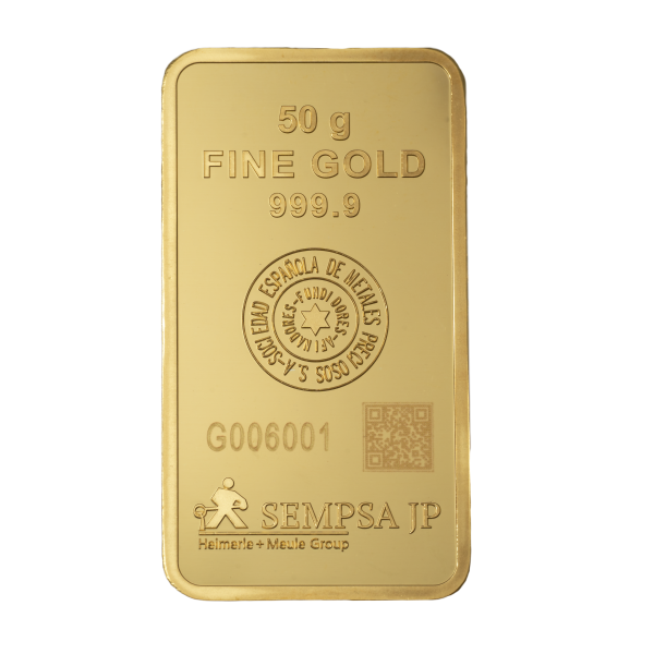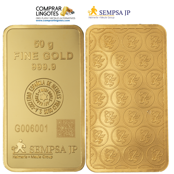 Fantástico lingote de oro fino 99,99% de 50 gramos, acuñado por la primera refinería nacional. La Sociedad Española de Metales Preciosos SA, SEMPSA, se constituyó en 1920 como la organización empresarial española más importante al servicio de joyeros, plateros y la industria consumidora de metales preciosos. Es una de las compañías que más confianza despiertan en el mercado de los metales preciosos gracias a su experiencia y la calidad de los materiales con los que trabajan.