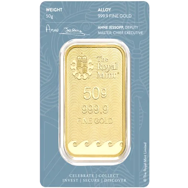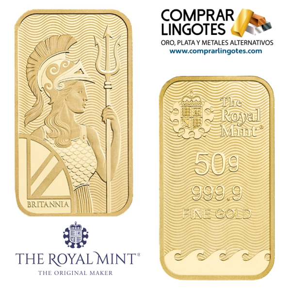 Lingote de 50 gramos de oro puro, The royal Mint, (24 quilates: pureza 99,99% o ,9999) en formato «minted bar», Sellado en un innovador blíster de plastico rigido precintado garantizando su óptima conservación y presentación.