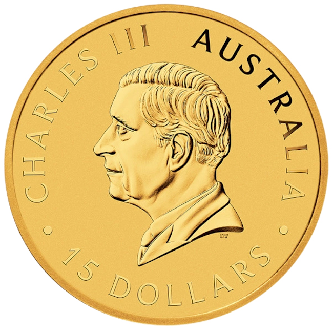 Muestra el retrato del monarca real británico Carlos III, porque Australia es miembro de la Commonwealth británica. El valor nominal de 15 dólares también se acuña en este lado de la moneda de oro.