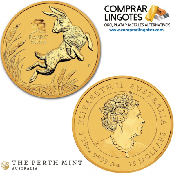 Moneda de Oro Año del Conejo 2023 (Perth Mint, Australia) de una décimo de onza de oro. Este es el cuarto lanzamiento de la Serie Lunar III de The Perth Mint. Cada moneda está acuñada con un 99,99% de oro fino,con un valor facial de 15 AUD por The Perth Mint Australia.