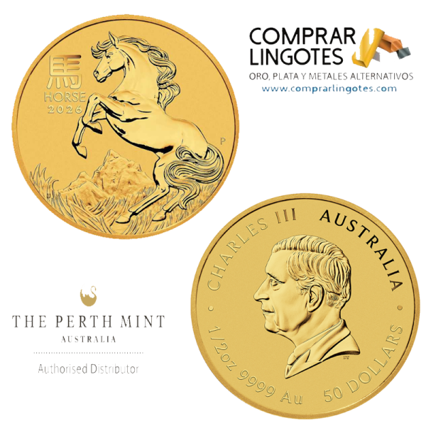 Moneda de Oro Año del caballo 2026  (Perth Mint, Australia) de 1/2 de onza de oro.  Este es el séptimo año de la tan esperada  Serie Lunar III de The Perth Mint. La serie está basada en los 12 signos del zodiaco del calendario lunar chino. La serie Lunar III en Feingold comenzó en 2020. Cada moneda esta acuñada por la Casa de la Moneda de Perth con 1/2 oz de oro puro al 999,9 % en calidad de bullion, con un valor nominal de 50 AUD la moneda es de curso legal bajo la Ley Monetaria Australiana de 1965.