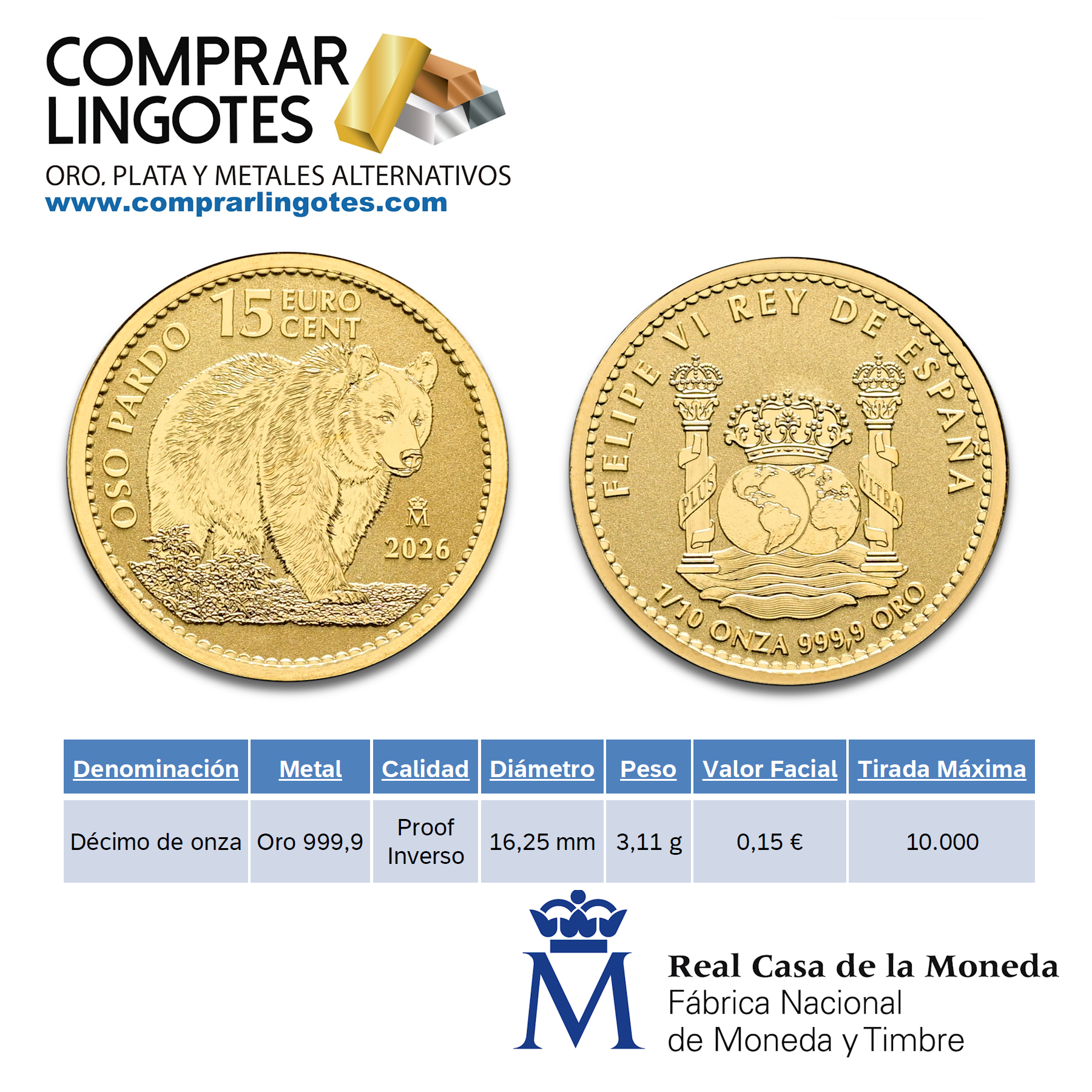 Este 2026, la Fábrica Nacional de Moneda y Timbre, debido al éxito obtenido en años anteriores con las primeras monedas de 1/10 de onza de oro de inversión española (lince, toro de liria y caballo cartujano y águila imperial), ha decidido continuar con una nueva emisión dedicada al Oso Pardo. Tiene un valor facial de ,15 euros y contiene 1/10 onza de oro fino 9999. Se trata de una serie limitada de la Fábrica Nacional de Moneda y Timbre – Real Casa de la Moneda, ya que el número máximo de piezas que se acuñen será de 10.000 unidades contando con una pureza de 999,9. Moneda de inversión y colección.