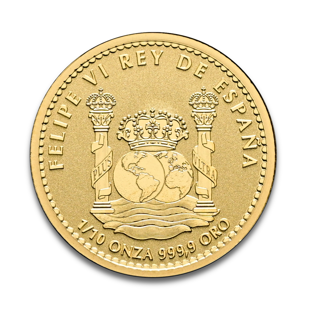 En el reverso muestra los motivos y leyendas de un real: dos hemisferios debajo de una corona real, flanqueados por las columnas de Hércules con el lema PLUS ULTRA, todo sobre un mar de olas. En la parte superior, en sentido circular, se encuentra «FELIPE VI REY DE ESPAÑA». En la parte inferior de la moneda, en sentido circular, se encuentra «1/10 ONZA 999,9 ORO».