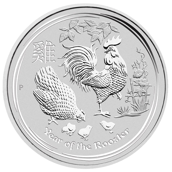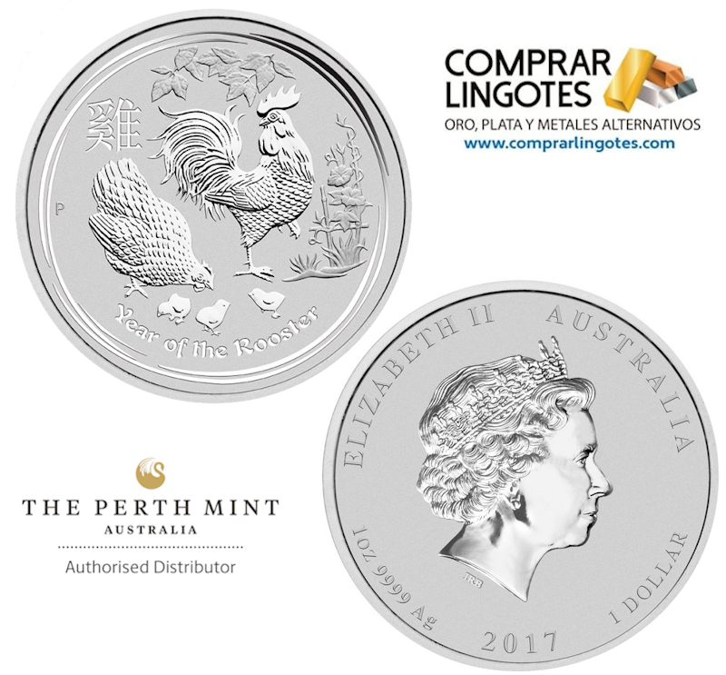 Moneda de plata, Año del Gallo «Rooster» 2017 (Perth Mint, Australia). La Moneda de Plata Lunar II “Año del gallo” de 1 oz es parte de la serie lunar de renombre internacional, que se basa en los doce signos del zodiaco del calendario lunar chino. Con su motivo cambiante anual, la serie es una de las monedas de colección modernas más buscadas en todo el mundo. Meticulosamente acuñadas en plata pura al 99,99 %, calidad habitual de alto relieve de la Casa de la Moneda de Perth Mint, las monedas son de curso legal según la Ley Monetaria Australiana de 1965.