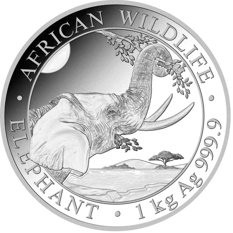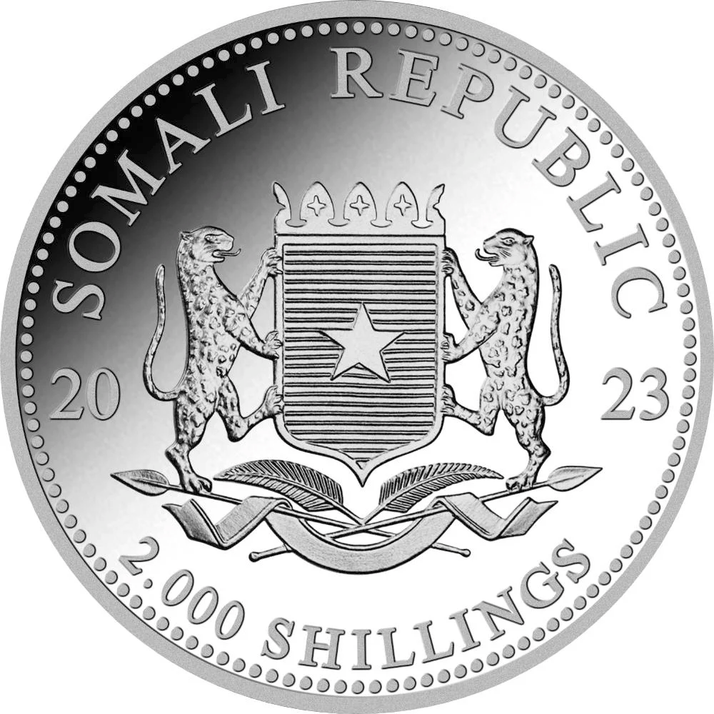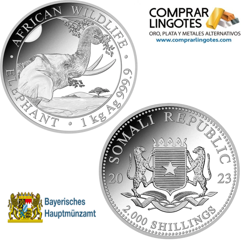 La moneda de Plata Elefante de Somalia 2023 de 1kg es acuñada en la Casa de la Moneda de Baviera en Alemania desde 2004. Con el consentimineto de la República de Somalia. La moneda de plata tiene una pureza de 99,99% y se emite en chelín somalí. El elefante de Somalia es moneda de curso legal en la República de Somalia, con un valor facial de 2.000 Shillings.