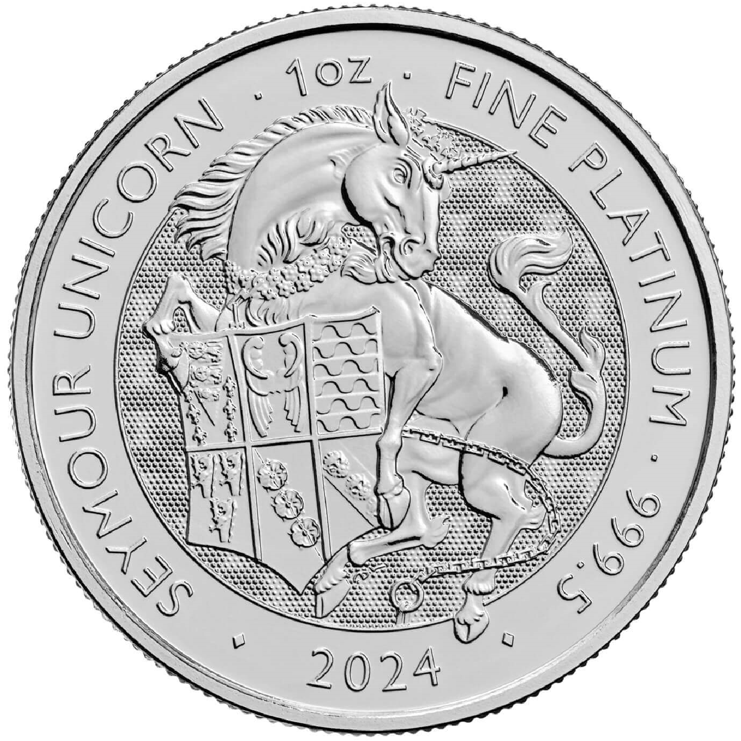 La moneda Royal Tudor Beasts Seymour Unicorn 2024 . La colección Royal Tudor Beasts proviene de las diez bestias de piedra que bordean el puente del foso del palacio de Hampton Court. Son los símbolos de la unión de Enrique VIII con su tercera esposa, Jane Seymour.